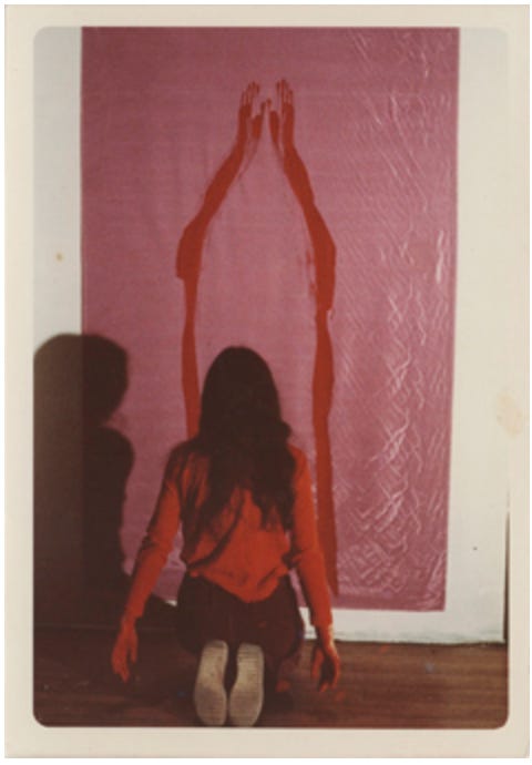 Her use of blood, as seen in pieces like Body Tracks (1974), further illustrates her exploration of ritual and bodily violence. Mendieta would drag her blood-covered hands down a white wall, creating visceral marks that evoke both violence and spirituality. Blood, a symbol of life and death, ties back to her interest in indigenous and African rituals, which often involve the use of blood as a sacred substance.