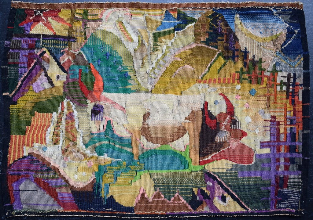 Gunta Stölzl (1897–1983) joined the Bauhaus in 1919 with a background in two-dimensional art. Although she had intended to continue painting, she was quickly redirected into the weaving workshop. By 1927, Stölzl became the Bauhaus’s only female master; a testament to her innovative approach and leadership (Silane 32–34). Her early work, including the piece later titled “Cows in Landscape,” merges painterly techniques with the material complexities of weaving. As a workshop reformer, Stölzl integrated technical instruction with experimental design, thereby ensuring that the weaving department became one of the school’s most productive and economically vital sectors. After leaving the Bauhaus in 1931, she established successful hand-weaving studios in Switzerland that continue to influence textile design.