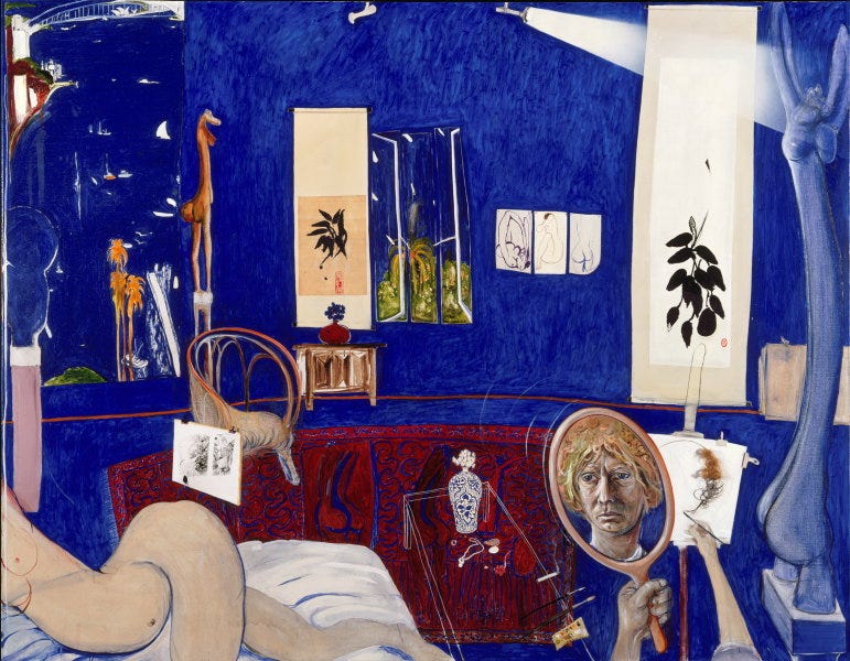 In Self-Portrait in the Studio, for example, Whiteley presents himself sitting in his studio, surrounded by the tools of his trade but physically absent from the center of the composition. His reflection appears in a mirror, suggesting that his true self is obscured or distant, a symbolic representation of the estrangement he felt from his own identity. The studio, once a place of creativity and inspiration, is transformed into a space of confinement and solitude. This work encapsulates the duality of Whiteley's life: the artist who created beautiful, evocative works but who was also trapped in a cycle of addiction and despair.