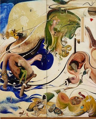 Whiteley's addiction to heroin had a profound impact on his creative output. Many of his works from the 1970s and 1980s reflect the chaotic and fragmented nature of his life during this period. Paintings such as Alchemy (1972-73) and The American Dream (1969) are filled with intense, often disorienting imagery that mirrors the psychological effects of drug use. In Alchemy, Whiteley uses a combination of abstraction and surrealism to explore themes of transformation, death, and rebirth, while The American Dream is a scathing critique of the American cultural landscape, influenced by Whiteley's experiences in the United States and his drug-fueled disillusionment.