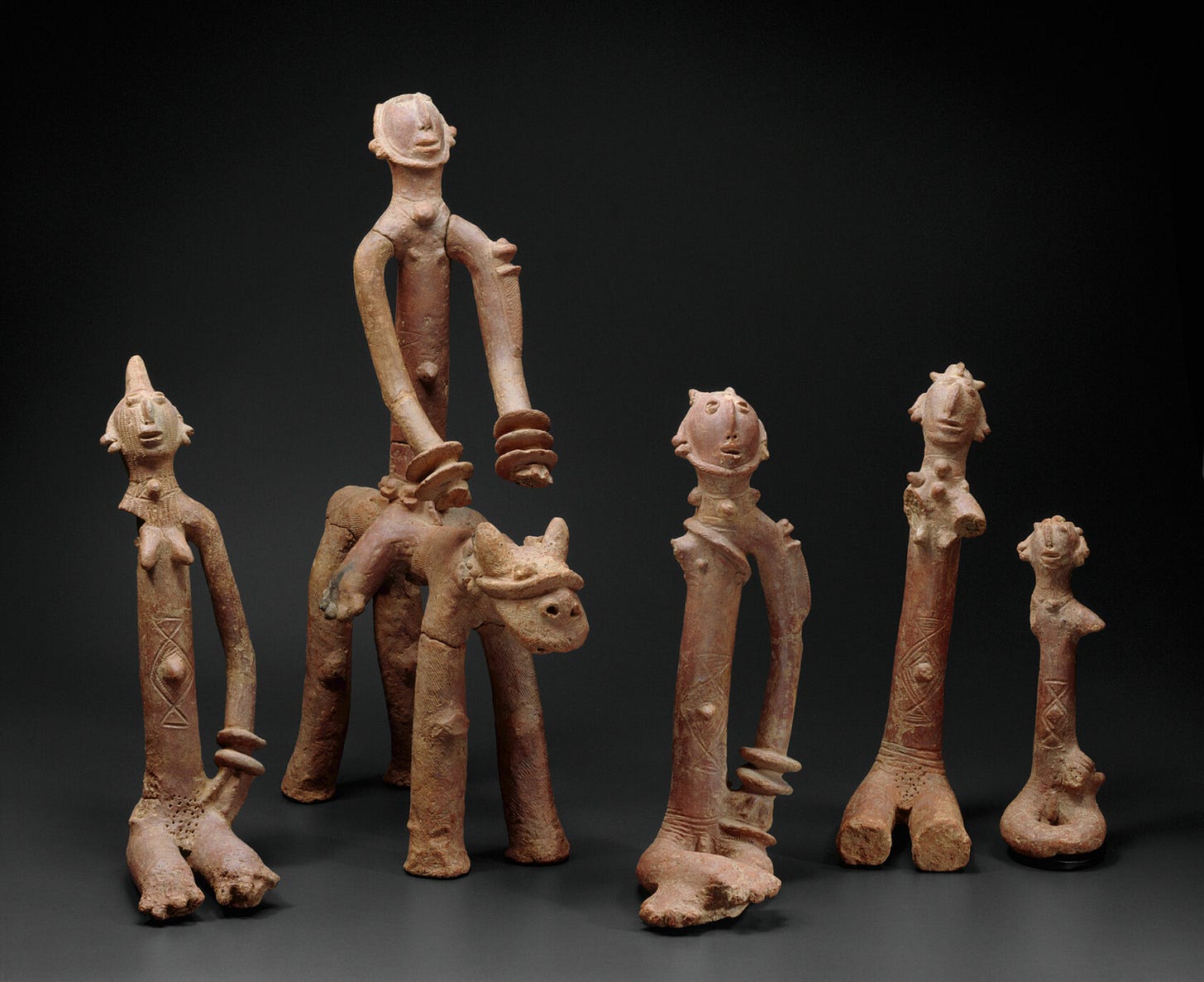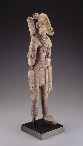 Even as Islam gained prominence, Mali’s sculptural traditions, rooted in older animist cultures, continued to thrive and adapt during the 14th century. Terracotta figurines, in particular, became one of the most celebrated art forms of the Mali Empire. At sites in the Inland Niger Delta region (around Djenné and Mopti), artisans sculpted clay into expressive figures often about 20–50 cm tall. These works were typically solid (sometimes built around a supporting iron rod) and were fired to a hard consistency. A common motif was the equestrian figure. Bearded warrior figures on horseback, wearing helmets and carrying quivers or spears. Such figurines likely symbolized power and prestige, given that cavalry was a key component of Mali’s military and social elite. One remarkable example is a terracotta cavalry warrior now in the National Museum of African Art, depicting a rider with ornate armor and bridles, dated roughly to Mali’s imperial era. A terracotta equestrian figurine (13th–15th century) from the Mali Empire. Such sculptures, often placed in ritual contexts or burials, depict mounted warriors in detailed regalia, reflecting the empire’s martial culture and artistic skill (National Museum of African Art, Washington D.C.).
