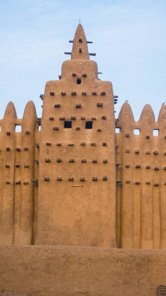 Among Mali’s architectural achievements, the Great Mosque of Djenné stands out as a triumph of mud-brick design and communal engineering. The original mosque on this site was built in the 13th century, traditionally credited to Sultan Koi Konboro after his conversion to Islam. While that medieval structure deteriorated over time, its legacy lived on. The current Great Mosque (erected in 1907 on the same site) preserves the essential form and techniques of its predecessors, illustrating methods used in Mali since the empire’s heyday. The Great Mosque of Djenné, in modern form (early 20th century), exemplifies the Mali Empire’s monumental mud-brick architecture. Wooden toron beams stud the façades as both decoration and scaffolding, and conical pillars are topped with ostrich egg finials, symbols of purity in Sahelian Islamic art.
