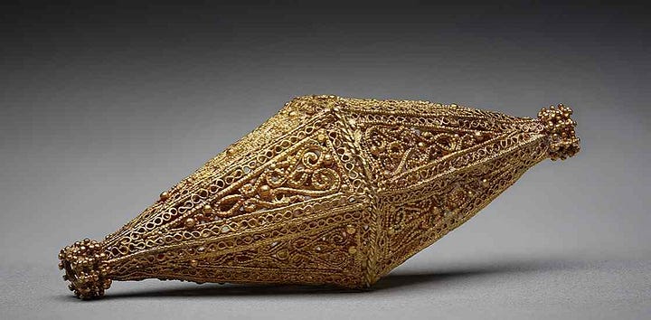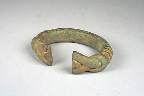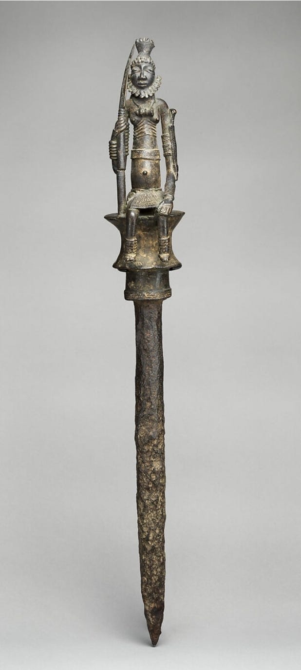 The Mali Empire’s abundance of gold and other metals gave rise to a sophisticated tradition of metalwork and jewelry by the 15th century, in which crafted objects served as both artwork and status symbols. Mali was renowned for its gold, and while much of it was exported or formed into ingots, a significant portion was transformed by local goldsmiths into exquisite items. In the imperial court, gold jewelry adorned royalty and nobility during ceremonies. Contemporary accounts emphasize that Mali’s kings were “richly adorned with necklaces around [the] neck and bracelets on [the] arms”. These pieces were likely crafted in the empire’s goldsmithing workshops, possibly located in or near the capital. Artisans employed techniques such as lost-wax casting (which was known in West Africa) to create intricate hollow beads, amulet cases, and filigree ornaments. Some surviving Mandé jewelry from slightly later periods (e.g. gold weights, pendants) suggest earlier styles: geometric or stylized forms often featuring Sahelian motifs like the stepped pyramid or knot design. One of the most spectacular pieces of regalia described is Mansa Musa’s golden crown and scepter. While these do not survive, Ibn al-Zuhri wrote that Musa’s crown was “encircled with gold” and his staff or rod topped by a golden ball or falcon. The golden falcon emblem atop the king’s staff (mentioned by al-‘Umari) likely represented the divine sanction of kingship. Creating such an object would have required exceptional skill. Smelting and refining local alluvial gold, then casting and hammering it into a lifelike bird form. Aside from regalia, goldsmiths made items for wealthy merchants and women of high status; earrings, hair ornaments, rings, belts, and even gold embroidery thread to be sewn into garments. Gold was not the only medium; copper and its alloys (bronze/brass) were also crafted. The empire had access to copper (notably from Akjoujt to the northwest and local sources), which artisans alloyed with tin or zinc to make bronze/brass for durability. By the 15th century, some regions under Mali (or its successor Songhai) developed notable bronze-casting traditions. The city of Jenne and others yielded cast brass figures of riders and animals in later excavations, hinting at a possible continuous tradition from Mali times of casting small metal icons. Additionally, the staff finials used by political or religious leaders were often made of cast copper alloy. An example from a slightly later era (17th–19th century but reflecting earlier motifs) is a bronze finial showing a mounted leader surrounded by attendants; a form possibly echoing Mali Empire precedents. Such staffs embodied authority and were likely present in Mali’s courts as well. Blacksmiths (nummo) in Mali, who worked iron for tools and weapons, also took on ritual significance. They sometimes forged ritual iron staffs with human or symbolic figures; these too are a form of metal art, often associated with power and initiation societies. The creation of fine metalworks was fostered by Mali’s wealth and its caste system which placed specialized groups (griots, blacksmiths, etc.) in charge of various crafts. Blacksmiths and smelters held a mystique; they were believed to have occult knowledge to transform ore into metal, a process often likened to magic. This elevated status of smiths meant their craft was respected and their products cherished. In fact, part of Mali’s oral history credits a mythical smith (sometimes called Dinga) with founding the Ghana Empire, and multiple blacksmith figures appear as heroes in the Epic of Sundiata. The reverence for smiths translated into patronage. They were commissioned to make not only utilitarian arms (spears, swords, stirrups) but also ceremonial pieces like intricately decorated swords and daggers for show. By the twilight of the Mali Empire in the 15th century, the tradition of fine metalworking remained robust. It would soon be inherited by the Songhai Empire (which minted coins and refined metal art further) and by local goldsmith families whose knowledge endured through generations. The jewelry and metal artifacts of Mali, though few survive, were thus key indicators of wealth and were art objects in their own right, blending functionality, symbolism, and dazzling craftsmanship.