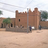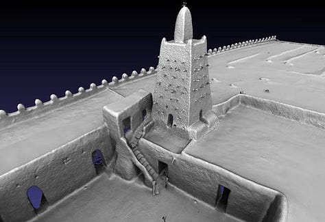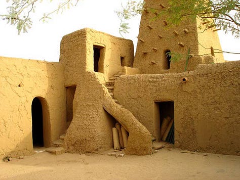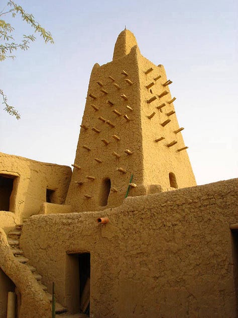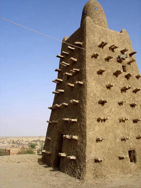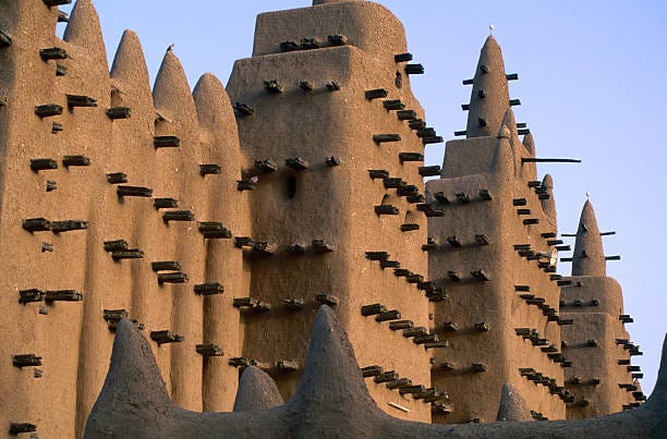 With the founding of the Mali Empire by Sundiata Keita in 1235, indigenous building techniques evolved into a monumental imperial architecture. Lacking abundant stone, Malian builders relied on Sudano-Sahelian methods; walls of packed earth (banco) reinforced by wood timbers. Early imperial cities such as Niani (Sundiata’s capital) were likely composed of mud-brick palaces and houses following the established local style. Excavations at Niani have indeed revealed stone foundations of elite houses, confirming chroniclers’ notes that wealthier Malians sometimes built in stone. More commonly, dwellings used beaten-earth bricks and had ceilings of wooden beams and reeds, often forming a conical, thatched roof. This construction was practical yet allowed for creativity in form; the wooden beams (later known as toron) projecting from walls provided structural support and a rhythmic visual pattern. By the empire’s early years (13th century), mosques and public buildings in Mali’s towns adopted this style, giving rise to a distinct architectural identity. The new royal and religious structures in Mali’s urban centers were essentially continuations of earlier West African building practices “used since prehistory and still in use today”, but on a larger scale. In emerging cities like Niani, Sudano-Sahelian mud architecture proved incredibly adaptable. Multi-story palaces and mosque complexes could be erected with only mud, wood, and skillful engineering. Thus, as Mali rose to power, it institutionalized the mud-brick architectural foundation laid by its predecessors and scaled it up to suit an imperial capital’s needs. This early architectural flourishing set the stage for Mali’s later famed monuments.
