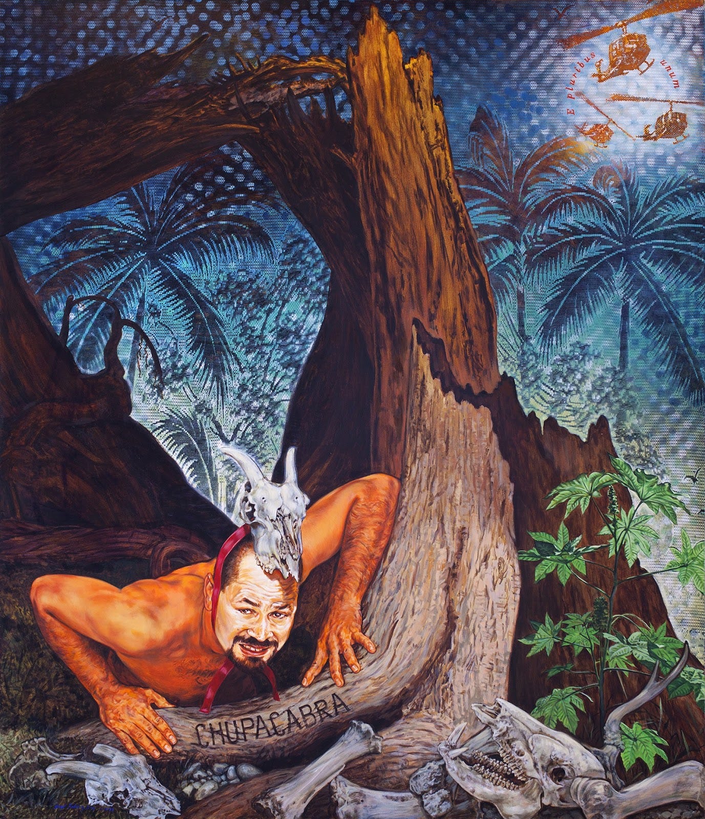 Contemporary Puerto Rican illustrators and printmakers have kept the 1995 morphology in circulation while updating technique, risograph zines, digital prints, and festival posters that stylize the back spines into serrated glyphs, further stabilizing the creature’s angular, nocturnal profile (Ross; Radford). Ángel Rodríguez-Díaz’s self-portrait as El Chupacabra (1998) repositions the monster as complex subject rather than menace, staging helicopters and searchlights against a figure bearing mask and animal skull to interrogate surveillance, coloniality, and border militarization. The painting is documented as the sole canvas in the artist’s Artpace installation A Splendid Little War (1998–99) and discussed in the exhibition book The Other Side of the Alamo: Art Against the Myth (Rodríguez-Díaz; The Other Side of the Alamo 178).