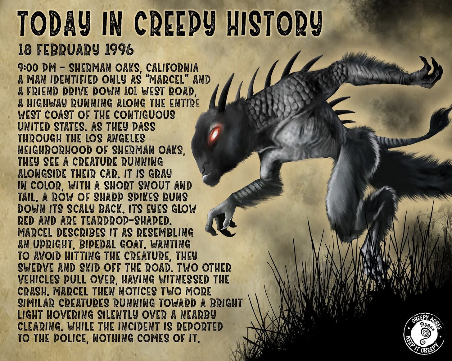 Since its sensational emergence in Puerto Rico in 1995, the chupacabra (“goat-sucker”) has moved swiftly through newsrooms, living rooms, and studios, morphing from alleged livestock predator into a flexible modern myth with a distinct visual life. Scholars and journalists alike have shown how the creature condenses post–Cold War anxieties, tabloid logics, and globalized entertainment into a figure that is at once local and portable (Radford; “Chupacabra,” Encyclopædia Britannica). As reports migrated from Puerto Rico to Mexico and the U.S.–Mexico borderlands, artists translated rumor into image. Talk-show sketches hardened into repeatable motifs (dorsal spines, gray skin, the raptor’s gaze) while later Mexican popular media and folk-art idioms absorbed the beast into alebrije-like hybrids and family-friendly animation (Ross; National Museum of Mexican Art; “Chupacabra,” Encyclopædia Britannica).