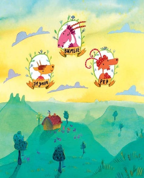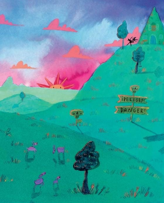 Folk-art vocabularies offered a ready matrix. In alebrije practice (wood-carved or papier-mâché hybrids), artists graft dorsal spines and bat-like ears onto feline, canine, and reptilian cores, saturating surfaces with stippled color fields and pattern bands; papel picado abstracts the silhouette into rhythmic voids and serrations; cartonería produces parade-scale bodies with ornate crests and exaggerated claws (National Museum of Mexican Art; “Alebrije,” Encyclopædia Britannica). Children’s illustration extends the domestication. Ana Aranda’s art for Marc Tyler Nobleman’s The Chupacabra Ate the Candelabra (2017) recasts the creature through saturated palettes and rounded forms, making a narrative foil resolved by play and wit (Penguin Random House).
