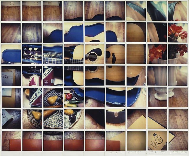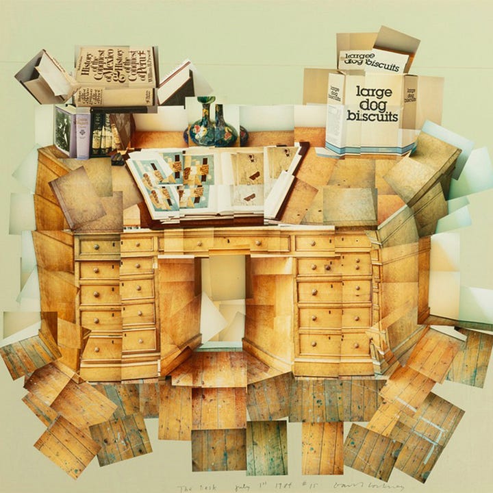 While it is difficult to draw direct lines between Hockney’s drug use and specific artworks, the periods during which he was known to be using marijuana and cocaine do coincide with some of his most experimental and, at times, disjointed works. The 1980s, in particular, saw Hockney exploring the intersection of photography and painting, creating large-scale photo collages that challenged conventional perspectives on space and time. Works such as The Desk (1984) and Still Life Blue Guitar (1982) reveal a fragmented, multi-perspective approach that mirrors the dissociative and disjointed nature of drug experiences.