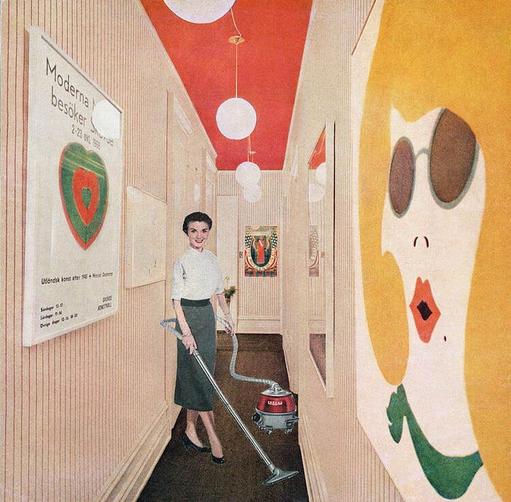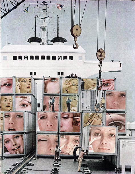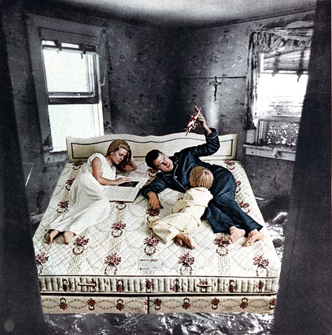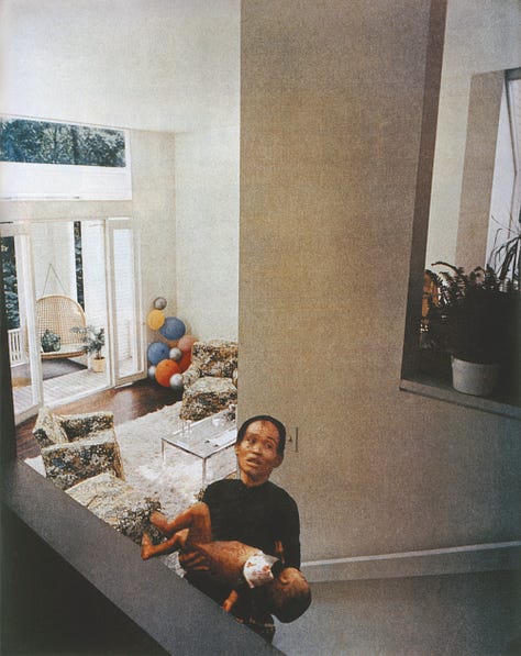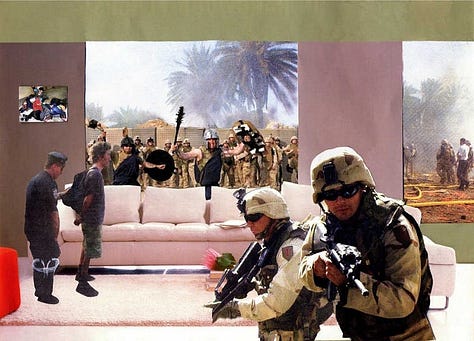 In Bringing the War Home (1967–72; revisited 2004–08), Rosler fuses images from the Vietnam and Iraq wars with the aesthetic of suburban interiors to expose the sanitized portrayal of conflict in the media. By inserting military figures into layouts reminiscent of House Beautiful, she highlights a stark disconnect between U.S. consumerism and militarism. Critics have connected this strategy to Guy Debord’s concept of the spectacle, emphasizing how Rosler transforms images of warfare into commodities. The later iterations of the series, which address the Iraq War, further critique neoliberal forces that sustain cycles of violence, symbolized through imagery of McMansions and Walmart aisles.