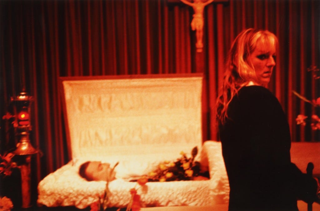 Goldin returned to document Cookie at her husband’s funeral just three years later. Cookie kneels beside the open casket in mourning. Art historian Jack Halberstam contends that the photograph “resists redemption narratives” and dwells in “the liminal space between life and death” (140). It is emblematic of how Goldin transforms personal grief into collective memory, particularly within the context of the AIDS crisis (The Guardian).