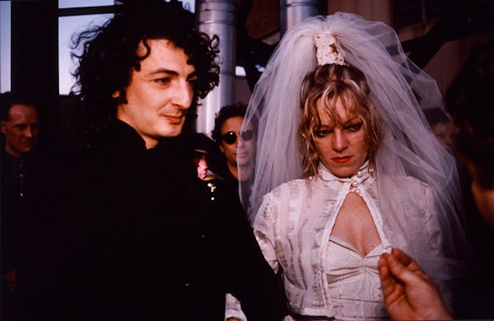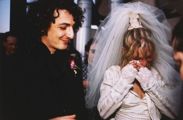 This image depicts the wedding of Cookie Mueller and Vittorio Scarpati, both close friends of Goldin, in a modest Manhattan apartment. The informal setting and emotional sincerity foreground queer resilience in the face of institutional exclusion. As Mary Beaufort argues, the wedding photographs “gave a visual testament to the legitimacy of queer love and ceremony” long before marriage equality (102).