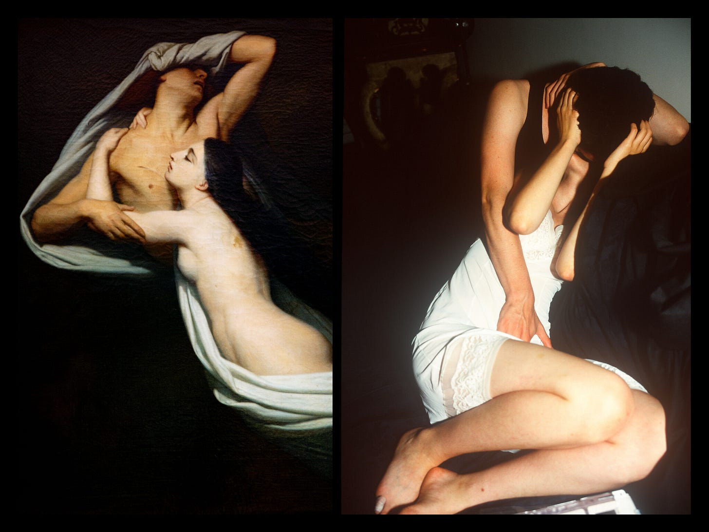 Commissioned by the Louvre, Scopophilia juxtaposes Goldin’s contemporary photographs with classical artworks. She positions images of her friends, often nude or in acts of intimacy, beside canonical paintings and sculptures, interrogating the gaze and erotic desire. Mulvey argues that this installation constitutes a “queer reappropriation” of museum space, where desire is centered on marginalized bodies (17; The Art Newspaper).
