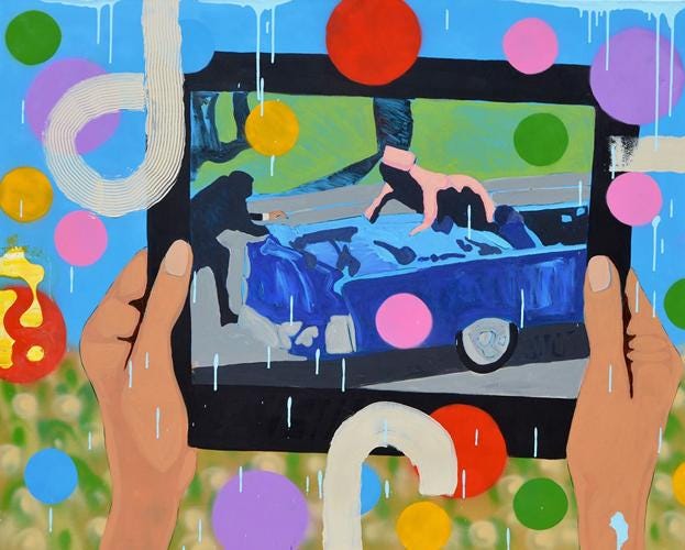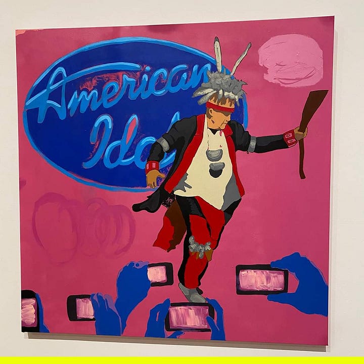 Hyde’s work often features elements of pop culture, such as emojis, memes, and iconic media figures, juxtaposed with Native symbols and references. This blending of the traditional and the contemporary is a deliberate effort to critique the ways in which Native identity is commodified and misrepresented in mainstream media (Lewis and Rader 89). For instance, Hyde’s use of digital motifs reflects the pervasiveness of technology and its impact on identity, suggesting that Native culture is not immune to the digital age but rather actively engages with it in complex ways.