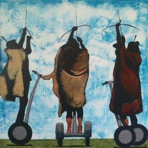 One of Hyde’s central themes is the exploration of Native identity in a world that often misunderstands or distorts it. His pieces, such as "Get Over It," "American Idol," "Buffalo Segway," and "You're Invited to a War Party," address the tension between Indigenous self-perception and external stereotypes. These works highlight the right of Indigenous people to define their own identities rather than being subject to the assumptions or expectations of others (Thomas 142). By using imagery that challenges stereotypes, Hyde’s work becomes an act of reclaiming and asserting Indigenous presence in the American cultural landscape.