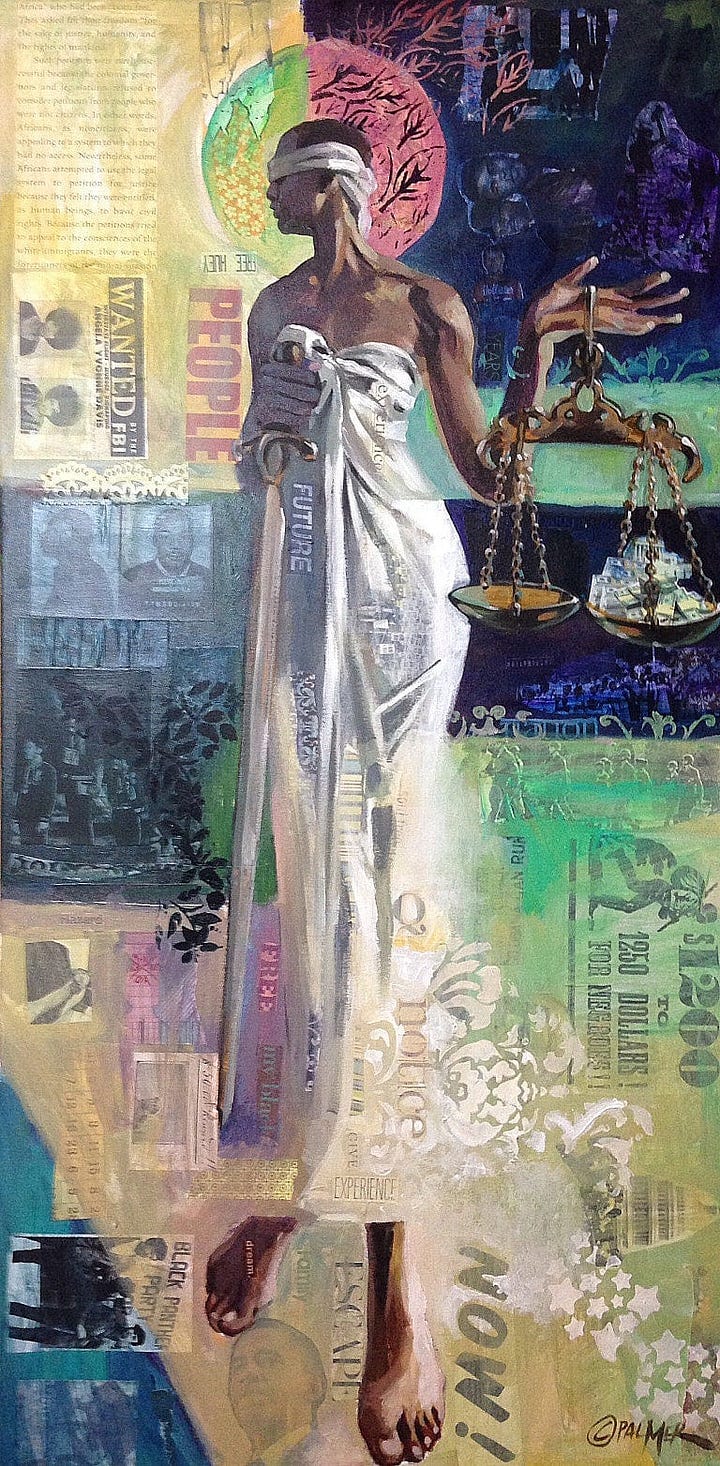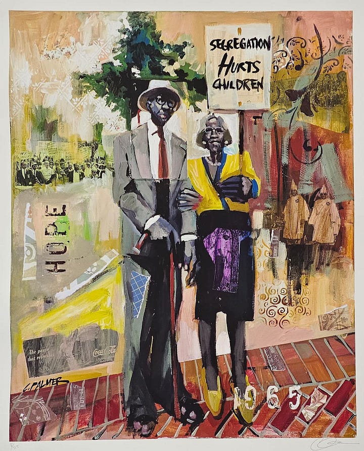 Initially known for his controlled, graphic work in the commercial realm, Palmer’s transition to fine art signaled a turning point in his creative journey. Working under the pseudonym “Carlos” for a period, he embraced spontaneity and loosened the strictures of his early style. This duality, between a meticulously controlled approach and a more liberated, abstract expression, has become a hallmark of his work. His celebrated “Civil Rights” series, for example, merges layered collage techniques with figurative painting to evoke both the pain of historical injustice and the resilience of the human spirit (Wikipedia). Themes of resistance, identity, and social justice permeate his compositions. Palmer’s imagery often incorporates symbolic elements, such as floral motifs introduced after his mother’s passing, that serve as metaphors for renewal and hope. His work extends beyond aesthetic innovation; it is an active engagement with the historical narratives of African American life, offering viewers a visual language through which to understand past and present struggles.