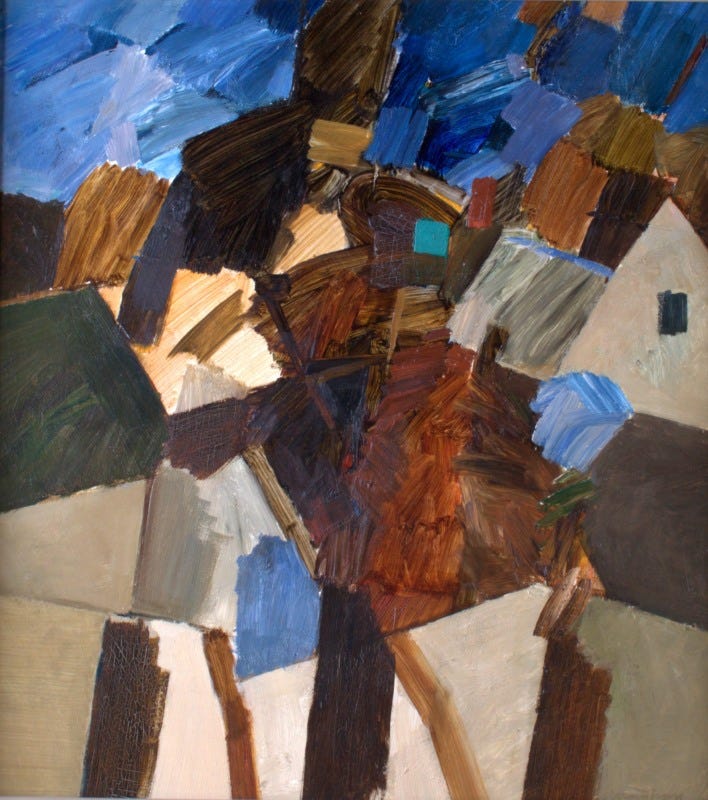 In works such as Boy Carrying a Tomato Plant (1945), acquired by Pallant House Gallery in 2017, Vaughan melded Neo-Romantic figuration with early modernist austerity, the lone youth rendered in contemplative stillness (Pallant House Gallery, “Keith Vaughan: Recent Acquisitions”). Later canvases like Figure Falling Forwards (1962–63) and October Landscape (1971) dissolve bodies into atmospheric fields, prefiguring the rugged textures of his late Assemblies and reflecting a post-war preoccupation with existential solitude (Martin 45).