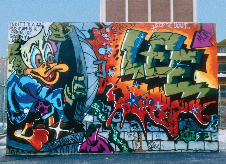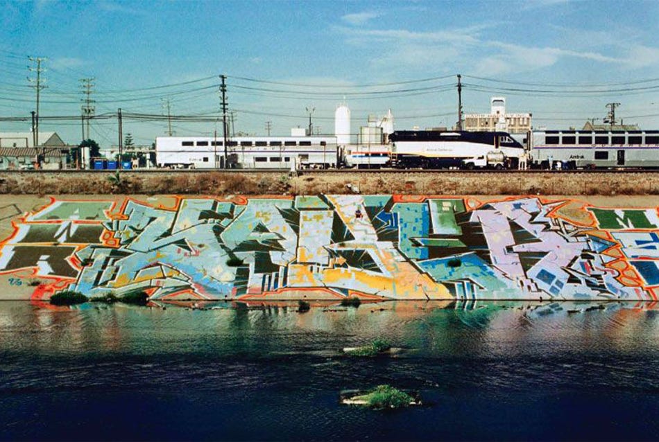 Street art as we recognize it began in New York City during the late 1960s and early 1970s. Graffiti writers like TAKI 183 and Julio 204 pioneered tagging, a simple yet revolutionary act of marking one's name on public surfaces. This practice emerged in marginalized communities as a means of visibility and self-expression amid systemic neglect. The rise of subway graffiti transformed New York’s urban landscape, with artists like Lee Quiñones and Dondi White elevating graffiti into elaborate, large-scale works that merged visual artistry with urban commentary (Castleman 48; Gastman and Neelon 96). Meanwhile, Los Angeles saw the rise of the Chicano mural movement, spearheaded by artists like Judy Baca, who used public walls to address issues of identity, cultural pride, and social justice. This tradition laid the groundwork for a uniquely West Coast fusion of graffiti and muralism, exemplified by artists such as Chaz Bojórquez, who incorporated traditional Mexican calligraphy and iconography into his work (Knight 112; McCaughan 34).