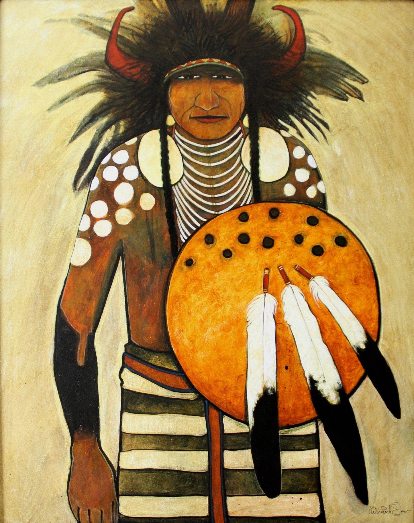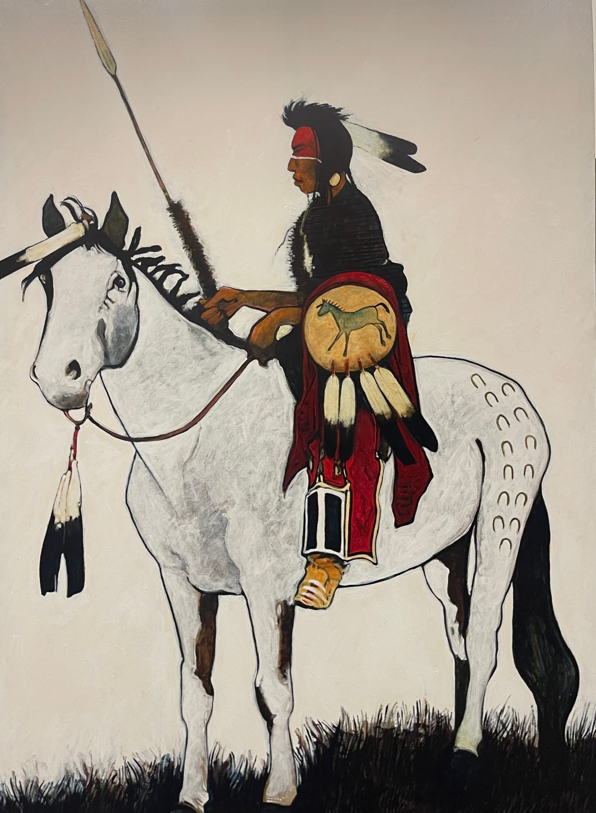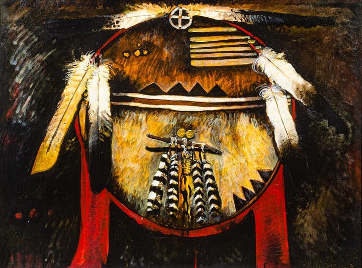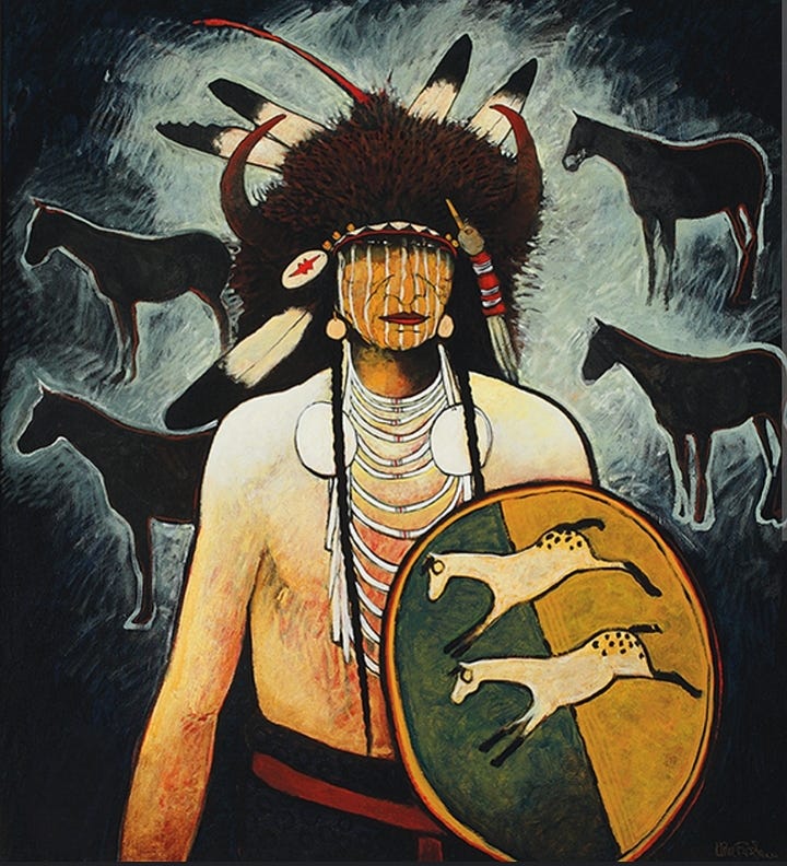 One of Red Star’s notable works, Horse Medicine, depicts a Crow warrior, adorned with traditional regalia. The bright colors and dynamic composition underscore the spiritual connection between the warrior and the horse, both of which are central to Crow identity. The horse, in particular, symbolizes mobility, power, and the intimate relationship between the Crow people and the natural world. Red Star’s attention to historical accuracy is evident in the portrayal of the warrior’s regalia, which aligns with documented Crow designs from the 19th century. Another important work, Medicine Shield, showcases a traditional Crow shield adorned with symbolic markings. Shields in Crow culture serve both as physical protection and spiritual guardianship. Red Star modernizes this symbol by placing it against an abstract, colorful backdrop, drawing attention to its symbolic significance. These works illustrate Red Star’s ability to merge traditional symbols with contemporary aesthetics, creating pieces that speak to both historical and modern audiences.