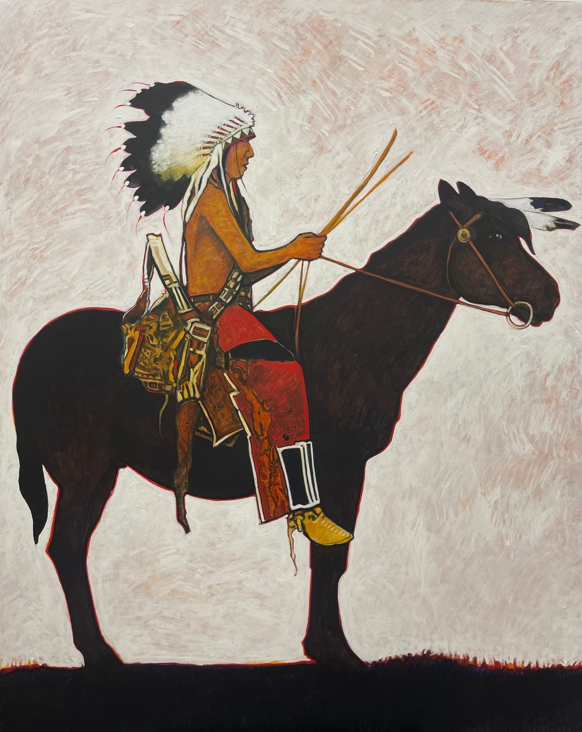 Red Star’s art is characterized by its bold use of color, geometric patterns, and symbolic representation. His palette often includes vibrant reds, blues, and earthy tones, reflecting both the natural landscapes of Montana and the vibrant regalia of the Crow people. These colors are not only aesthetic choices but also carry cultural significance. His work often features Crow warriors, horses, and ceremonial regalia, all integral to Crow culture. The figures in his paintings are depicted in powerful, almost heroic poses, symbolizing strength and resilience. As art historian Janet Berlo notes, “Red Star’s use of bold, contrasting colors imbues his subjects with a mythic quality, making them timeless embodiments of Crow culture” (Berlo and Phillips 45). In addition to his distinctive use of color, Red Star integrates geometric patterns inspired by traditional beadwork and textiles, reflecting a deep respect for Crow craftsmanship.