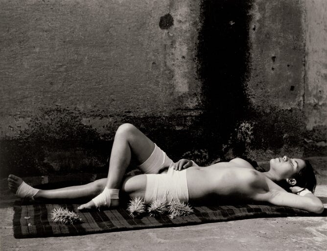 One of the defining characteristics of Álvarez Bravo’s work is its relationship to surrealism. Although he is often described as a surrealist photographer, his approach to surrealism was distinctly Mexican. He did not create artificial, dream-like scenes, as many European surrealists did. Instead, he found surrealism in the real world, capturing moments that possessed an otherworldly, symbolic quality. This can be seen in works like La buena fama durmiendo (The Good Reputation Sleeping, 1938), where a reclining woman’s body is veiled with bandages, creating an image that evokes both beauty and death, sensuality and mystery.