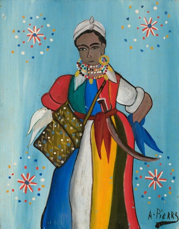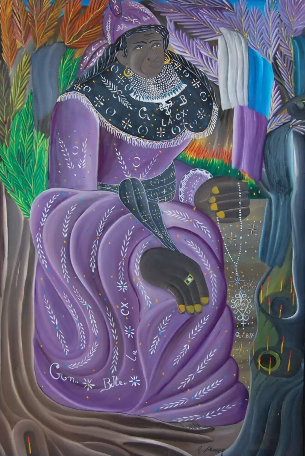 Maman Brigitte’s peppered heat and the Gede cohort’s carnivalesque leer paint graveyard wit in violet, black, and white. Pierre’s chroma, Hyppolite’s deadpan saints, and contemporary drapo vitrines make that palette legible across media (Cosentino; High Museum).