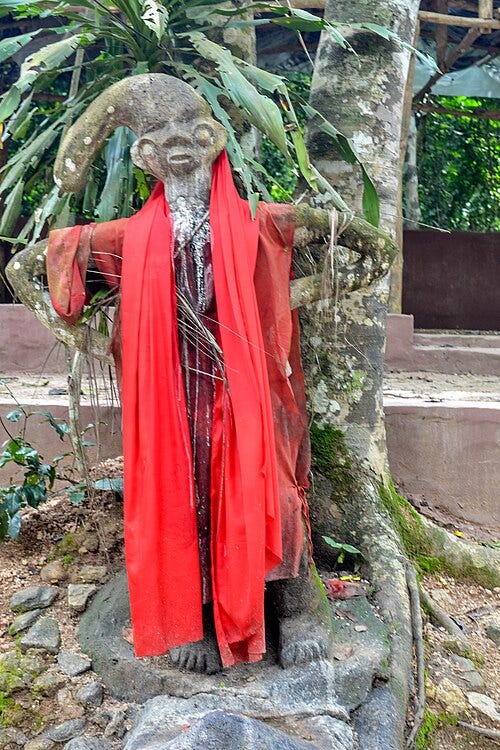 Roosters and sharp iron belong to Ogou; black dogs shadow Baron and the Gede; goats circle Kalfou’s volatile crossroads, iconographies that artists render as warnings and guides rather than mere symbols (Cosentino 150–56; Deren 133–45).