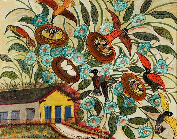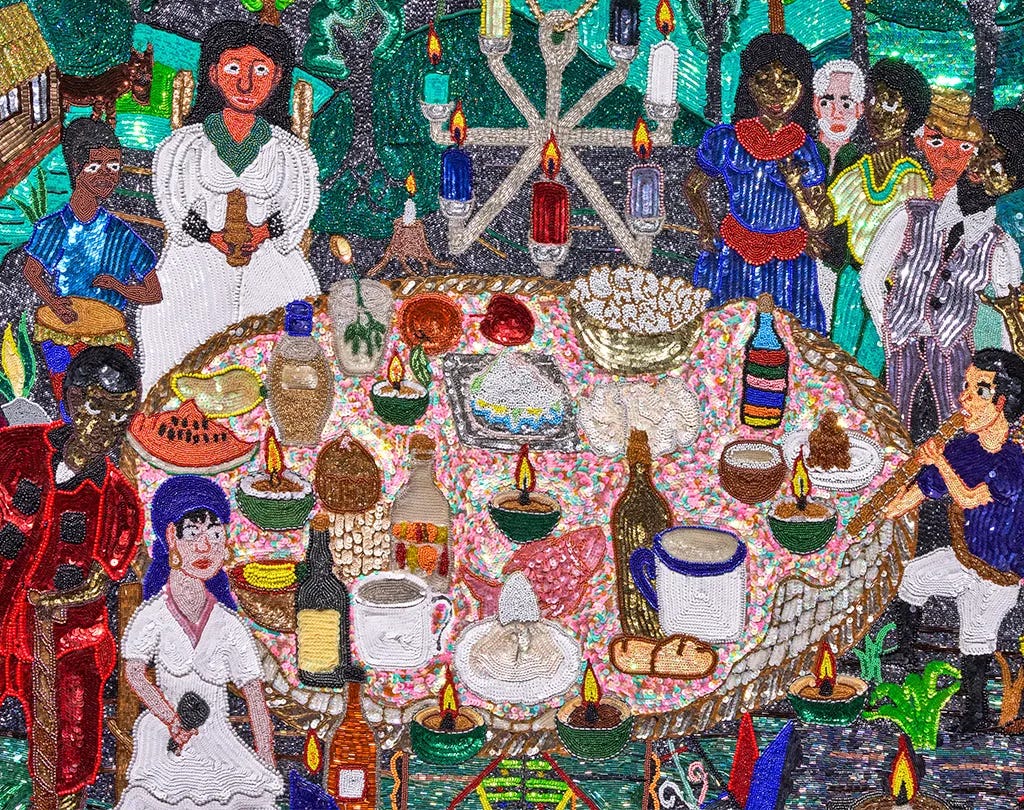 Drapo are ceremonial power-points. Sequined constellations that identify temples and salute specific lwa. Constant is a contemporary master whose flags expand from temple scale to museum wall without losing liturgical intelligence (Fowler Museum; PAMM). Painters like Hyppolite and Pierre often compose canvases like flags, frontal emblems set in starry fields, testifying to drapo’s visual sovereignty. (The Metropolitan Museum of Art)