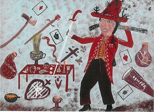 Vodou and Hoodoo meet, sometimes fraternally, sometimes in friction, at a crossroads where color, drum, dust, and story are not embellishments but instruments. Vèvè open doors, flags steady the threshold, drums crank the engine of time, and possession paints double portraits that neither canvas nor camera can fully hold. The same cosmology travels in mojo hands and bottle trees, in cemetery offerings and porch altars, along with the laughter of Gede and the judicial fury of Ogou. Across this Atlantic grammar, figures like Laveau, Hurston, Beauvoir, Mama Lola, Makandal, Boukman, and High John teach that art is a ritual verb; something one does to adjust the balance between risk and refuge, grief and humor, the living and the dead. (Brown; Deren; Hazzard-Donald; Anderson; Cosentino).