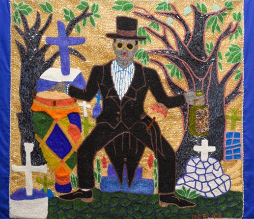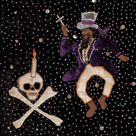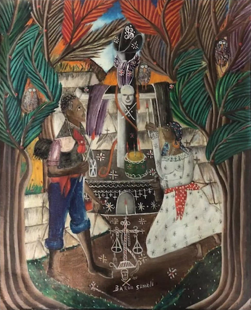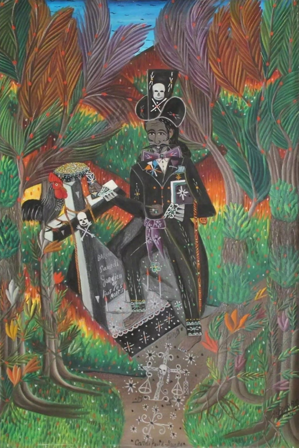 Baron’s icon (top hat, cane, skull grin, dark lenses) signals boundary humor: a civil servant of death who loves rum and smokes while enforcing rules (Cosentino 190–98). Hyppolite’s and Pierre’s Barons are definitive; urbane, terrifying, tender, and funny at once (NGA; The Met; Smarthistory).
