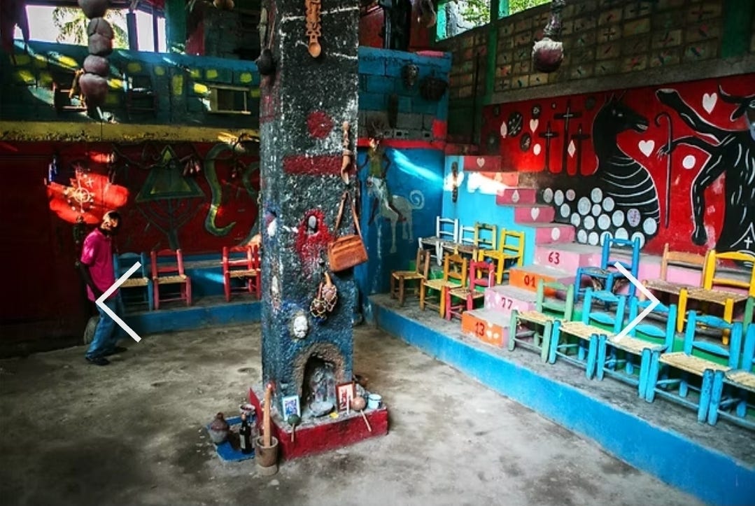 Public Vodou rites unfold around the poto mitan (center post), a vertical world-axis for spirit descent. Ati Max Beauvoir’s public leadership (2008–2015) made the peristyle a civic stage as well as a sacred one; in diaspora, Mama Lola’s Brooklyn temple shows how the poto mitan travels and re-roots (Brown 101–138). Artists Hyppolite and Pierre painted nocturne services with layered space, flags, and drums; visual scores of possession’s approach (Cosentino 211–19).