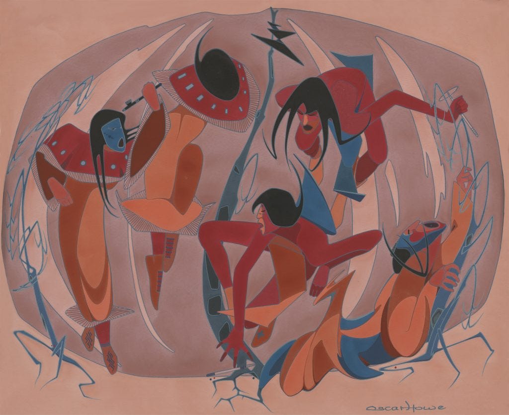Howe’s abstraction allowed him to move beyond literal representation, instead focusing on the emotional and spiritual essence of his subjects. His fragmented forms echo Dakota cosmology, where physical and spiritual realms intertwine (Ash-Milby 25).