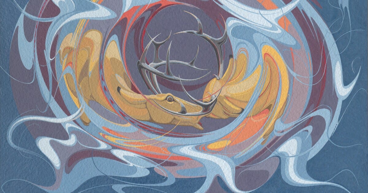 Fighting Bucks (1967) uses sharp, intersecting lines and vibrant colors to depict two deer in conflict. The piece reflects the Dakota worldview of balance and struggle in nature (Ash-Milby 22).