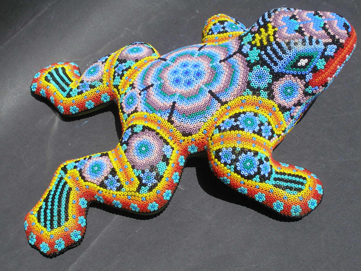 Contemporary Indigenous Huichol art, rooted in the visionary experiences of peyote rituals, features vibrant yarn paintings and beaded sculptures. These works incorporate sacred symbols such as deer, serpents, and maize, visually narrating the spiritual journeys of their creators.
