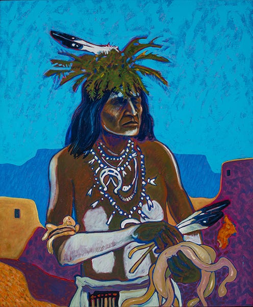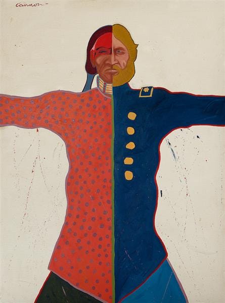 Cannon's time as a soldier in Vietnam deeply influenced his art. In pieces like Soldiers (1970), he explored themes of sacrifice, identity, and cultural paradoxes. This painting juxtaposes a Native figure in traditional dress with one in military uniform, symbolizing the conflicting roles many Native Americans navigated during service to a country with a fraught history of Indigenous oppression (Hyperallergic).