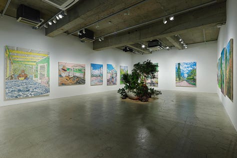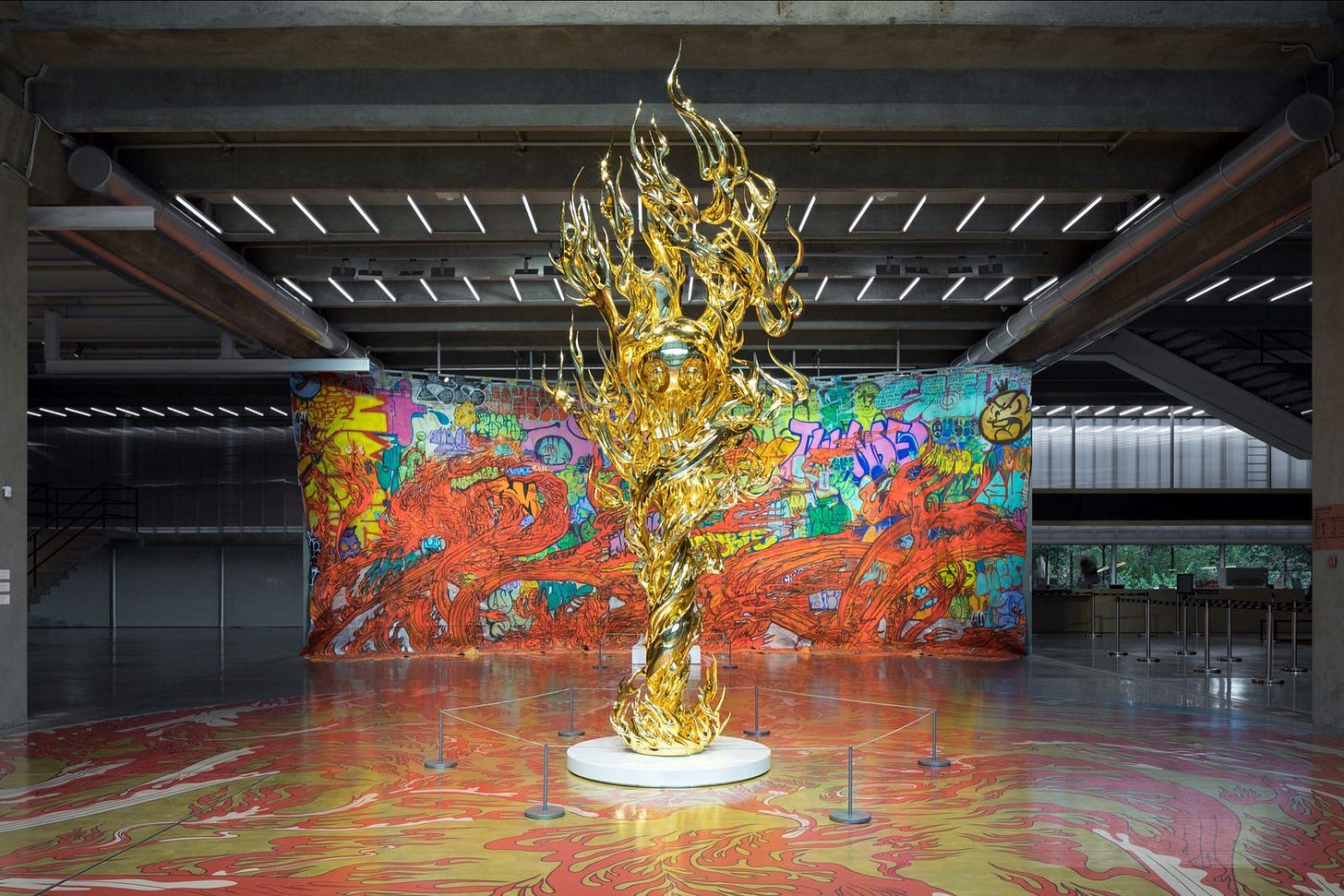 Murakami’s 727 (1996) spans three panels to depict Mr. DOB atop a stylized wave, fusing Hokusai’s formal grammar with existential unease, thus articulating the visual manifesto of Superflat’s flattened perspective (The Museum of Modern Art). DOB in the Strange Forest (1999) emphasizes the dialectic of kawaii and macabre, representing cultural anxiety through cartoon tropes (Mori Art Museum). In Tan Tan Bo Puking (2002), the grotesque spectacle of a vomiting mushroom foregrounds Superflat’s critique of utopian fantasy and chemical excess (Everything for Art). Murakami’s recent paintings incorporate Rinpa gold leaf techniques to deepen the dialogue between tradition and pop (The Guardian).