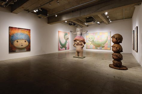 Murakami’s 727 (1996) reimagines Hokusai’s Great Wave in polka-dotted purples, merging Western pop motifs with Edo composition, and introducing his skull-eyed alter ego Mr. DOB to symbolize the anxiety beneath kawaii cheer (The Museum of Modern Art). In DOB in the Strange Forest (1999), the grinning mascot stands amid a cartoonish forest, combining innocence and menace to critique the dark undercurrents of mass-produced desire (Mori Art Museum). Tan Tan Bo Puking (2002) features a monstrous mushroom vomiting rainbow hues, a grotesque yet playful allegory for chemical excess and psychedelic consumerism (Everything for Art).