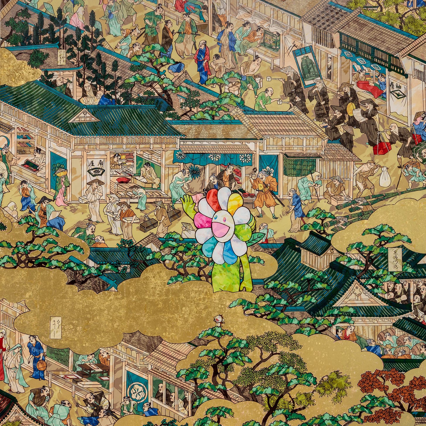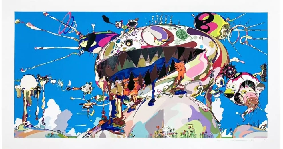Takashi Murakami’s Superflat art movement reframes Japan’s two-dimensional visual traditions through the lens of postwar otaku culture and global consumerism, creating a seamless intersection of high art, pop imagery, and mass-market merchandise. By coining “Superflat” in 2000, Murakami both described a formal aesthetic, bold outlines, flattened perspective, layered compositions, and diagnosed how consumer desires “flatten” social hierarchies, spiritual depth, and artistic distinction (Arts Help). From early paintings like 727 and DOB in the Strange Forest to his Louis Vuitton collaborations and immersive installations, Superflat interrogates the commodification of culture while reviving Edo-period flatness as a tool for cultural self-examination (The Art Story).