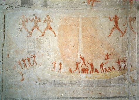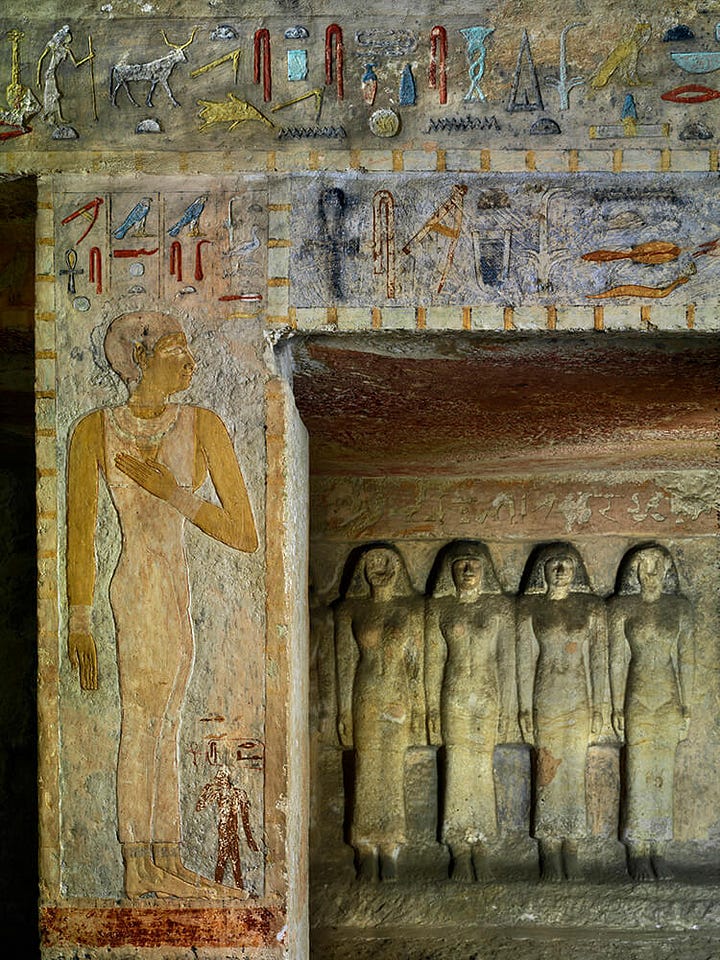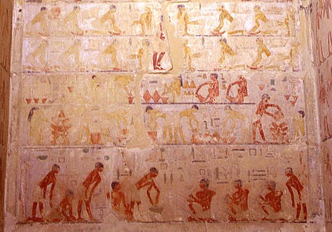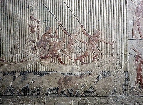 In wall paintings and reliefs inside tombs, we see detailed “visions of the afterlife” crafted to provision and protect the deceased. A common scene, established in Early Dynastic mastabas and continued throughout Egyptian history, shows the tomb owner seated before an offering table laden with food, accompanied by inscriptions of offering lists. The Egyptians believed that by depicting and inscribing these offerings, they would be magically made available to the dead in the hereafter. As the Met Museum’s description notes, the offering scene “magically provided for the deceased in the afterlife, thus guaranteeing his continued existence”. Such scenes became ubiquitous because of their fundamental religious function; they were not mere illustrations but active invocations of sustenance. Additionally, scenes of daily life that adorn the mastaba tombs of Old Kingdom officials (for example, the 5th Dynasty tombs at Saqqara and Giza) had a similar purpose. Depictions of farmers plowing fields, cattle being tended or slaughtered, fishermen netting the Nile’s bounty, craftsmen at work, and family members in domestic activities were not nostalgic genre scenes, but rather a way to ensure those activities would continue for the tomb owner’s benefit in the afterlife. By representing an idealized version of daily life, abundant harvests, successful hunts, bustling workshops, the tomb owner could partake in those eternal pleasures and provisions after death. For instance, the famous 5th Dynasty Tomb of Ti at Saqqara features lively reliefs of the tomb owner supervising boat-building and cattle crossing the river, scenes believed to secure Ti’s eternal enjoyment of those aspects of life. Even leisure activities like fowling in the marshes or playing music appear in later Old Kingdom and Middle Kingdom tombs, again reflecting the idea that “to depict something was to make it real” in the beyond.