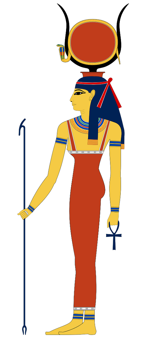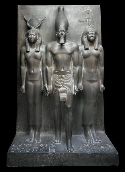 Divine symbolism pervades Egyptian art in this era, and the pantheon of gods and goddesses are frequently represented or alluded to. The Egyptians developed a strict iconography for their deities early on. By the Old Kingdom, conventions dictated that each god be shown in a specific form; often anthropomorphic with distinctive animal attributes. In tomb and temple reliefs, we find gods like Horus depicted as a falcon-headed man, Anubis as a jackal-headed figure, and goddesses such as Hathor sometimes manifesting as a cow (or a woman with cow’s ears and horns). These forms remained so consistent that for over 3,000 years, Horus had to have a falcon’s head, Anubis a jackal’s, and so forth, which helped viewers instantly recognize the deity and the associated ideas. In the Early Dynastic period, the falcon of Horus already appears as a royal symbol (for example, hovering above Narmer’s head on the Narmer Palette), indicating the king is the earthly Horus. Deities are shown in Old Kingdom tombs and temples either interacting with the king or receiving offerings from priests and the deceased. A 4th Dynasty example is the series of triad statues of King Menkaure, which depict the pharaoh flanked by goddess Hathor and a personified nome (province) goddess; underlining how gods and local spirits affirmed the king’s dominion. The presence of deities in art was not decorative; it was meant to invoke their protection and to situate the human (or royal) subject in the divine order. As one Old Kingdom text declares, the king was “the son of Ra” by the 5th Dynasty, pharaohs even adopted the title Sa-Ra to proclaim this divine sonship. Thus, in visual art, we see the sun god Ra often symbolized by a solar disk or by a falcon, and the pharaoh making offerings to Ra or receiving the ankh (life symbol) from him, emphasizing this special relationship.