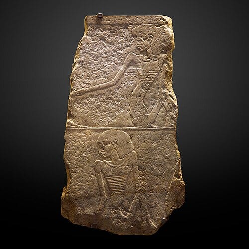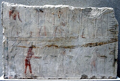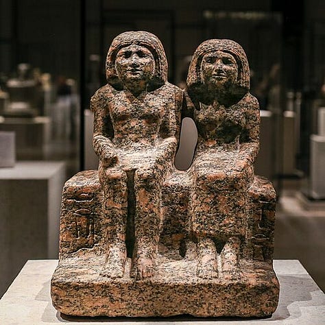While kings and gods dominate much of the art, Old Kingdom tombs also provide rich insight into daily life and the society of the time through art. High officials adorned the walls of their mastabas with scenes that reflected their worldly activities and possessions, which in turn mirrored the social values and structure of Old Kingdom Egypt. In these tomb reliefs and paintings, we see a microcosm of Egyptian life: peasants farming, fishermen casting nets, boatmen rowing, artisans engaged in metalworking, carpentry or brewing beer, domestic scenes of wife and children, and even moments of humor or realism; such as a clumsy servant falling or a hippo hunt in the marsh. These representations were idealized snapshots meant to ensure those aspects of life would perpetually benefit the tomb owner, but they also tell us about what the Egyptians valued. Scenes of agriculture and craftwork emphasize abundance and skilled production, highlighting the prosperity under the tomb owner’s (and by extension, the pharaoh’s) management. Depictions of family members and offering bearers stress the social roles of wives and children in caring for the deceased and the importance of lineage. For example, in many 5th Dynasty tombs, the tomb owner’s wife is shown standing or seated beside him, often smaller in scale (reflecting her secondary status due to hieratic scale) but affectionately close, with an arm around him. Such portrayals of women in Old Kingdom art usually present the elite woman as the supportive spouse or mother. Royal women (queens) are likewise shown in relation to the king: a notable sculpture is the dyad statue of King Menkaure with his queen (likely Khamerernebty II) where the queen stands at nearly the same height as the king, her arm around his waist, signifying her important but still accompanying role. Queens in the Old Kingdom could wield significant influence (as regents or great royal wives), yet in art they are typically not depicted independently until much later periods. Nonetheless, some queens had their own small pyramids and chapels decorated with reliefs (for example, Queen Meresankh III’s tomb features splendid painted reliefs of her and her mother). Goddesses and female figures also appear, in addition to major goddesses like Hathor, we see representations of noblewomen engaged in ritual (priestess roles) or as mourners in funerary scenes, indicating women’s roles in religious practice.
