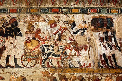 Old Kingdom art also documented Egypt’s interaction with foreign peoples, though always from an Egyptian perspective. In official art, foreigners are often shown as enemies vanquished by the king or as bearers of tribute and exotic goods. A 6th Dynasty tomb of Harkhuf, for example, mentions a dancing pygmy (perhaps from Nubia) brought back to the court; while not pictured in relief there, it reminds us that contact with Nubia and farther lands occurred. In the 5th Dynasty reliefs of Sahure, we see the king smiting Libyan chieftains and also welcoming long lines of tribute bearers carrying items like incense trees, gold, and animals from the land of Punt or the Near East. Foreigners are depicted with clear ethnic markers, Nubians with darker skin and curly hair, Libyans with side-locks of hair and patterned cloaks, Asiatics with pointed beards, and these distinctions are among the earliest recorded depictions of other ethnic groups in art. They serve to contrast the orderly Egyptian world (often aligned in registers and led by the pharaoh) with the chaotic foreign world, thus justifying Egypt’s domination as part of divine order.