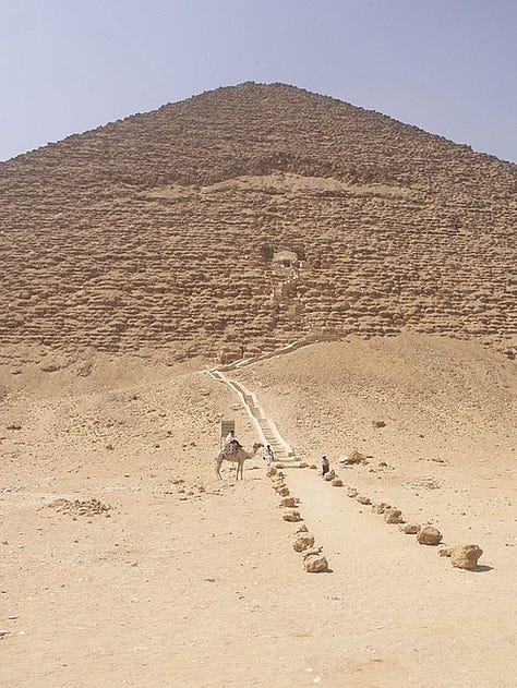 The pyramid form reached its perfected shape in the 4th Dynasty. Pharaoh Sneferu (c. 2613–2589 BCE) experimented with pyramid design in three major projects, transforming the earlier stepped form into the true pyramids of the Old Kingdom. Sneferu’s architects first attempted to convert the stepped design into smooth sides at Meidum (by filling in the steps with casing stone), but the Meidum Pyramid partially collapsed; likely due to structural instability. Learning from this, Sneferu commissioned the Bent Pyramid at Dahshur, which begins with steep angles and then shifts to a shallower incline partway up – an adjustment probably made during construction to prevent collapse, resulting in its curious “bent” profile. Finally, Sneferu succeeded with the Red Pyramid at Dahshur, the first completely smooth-sided pyramid, establishing the 43° angle that would be standard for subsequent pyramids. These projects show a rapid progression in engineering knowledge; Sneferu’s builders mastered techniques of laying massive stone blocks, adjusting pyramid angles, and constructing stable foundations.