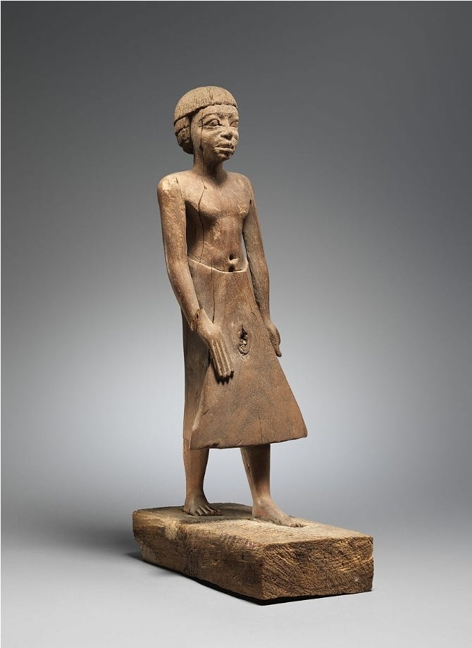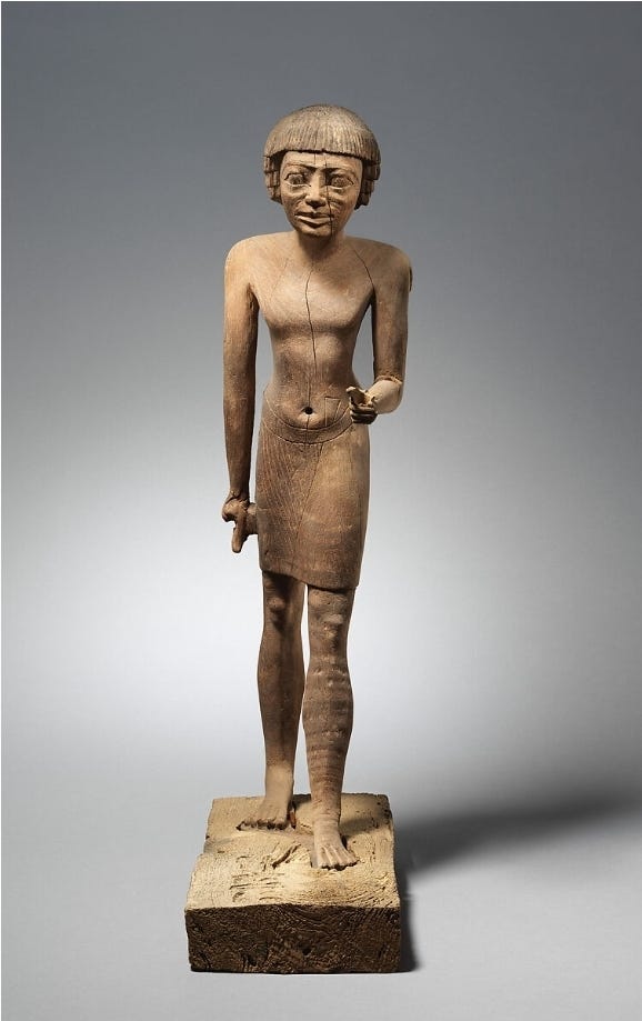 Another intriguing aspect of Old Kingdom funerary art is the inclusion of servant statues and reserve heads. Elite tombs sometimes contained small statuettes of servants performing tasks (grinding grain, baking bread, etc.), which were meant to magically come to life and serve the deceased; a further reflection of how art functioned in the afterlife belief system. The so-called “reserve heads,” peculiar to the late 4th Dynasty, were plain limestone portrait heads found buried in non-royal tombs around Giza. These heads are remarkable for their individualized facial features; they may represent an early form of portraiture for commoners or an alternate home for the spirit (ka) in case the body was damaged. Their exact purpose is debated, but one theory is that they were a kind of substitute for the body or a “spare” head for the soul to inhabit. If true, it underscores again the Egyptian concern with providing multiple safeguards for the continuation of life after death.