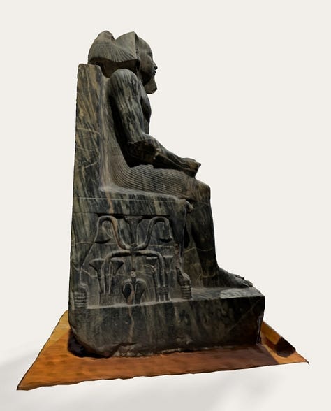 Sculpture and monumental art were harnessed as vehicles of royal ideology, effectively, political propaganda in stone. Many Old Kingdom reliefs glorify the king’s victories and his stewardship of Egypt’s prosperity. Notably, the 5th Dynasty pharaoh Sahure decorated the walls of his mortuary temple at Abusir with elaborate scenes of the king triumphing over foreign enemies and receiving tribute from distant lands. In these scenes, Egyptians are depicted as orderly and victorious, while foreign peoples (Nubians, Libyans, Asiatics) appear as either subjugated foes or bearers of exotic gifts, underscoring Egypt’s dominance. Such imagery reinforced the idea of the king as conqueror and benefactor who maintains world order. Even architectural elements carried royal symbolism: the throne of King Khafre’s famous seated statue is carved with the sema-tawy motif, the heraldic symbol of the unity of Upper and Lower Egypt, signifying the pharaoh’s role in “binding” the land together. On the same statue, a falcon representing Horus wraps its wings protectively around the king’s head from behind, visually merging god and king. The king also wears the royal uraeus (cobra) on his forehead, embodying the goddess Wadjet’s protection. These details communicate that the pharaoh is divinely guarded and empowered. Indeed, to an approaching viewer in Khafre’s valley temple, the Horus falcon would initially be visible embracing the king; but when viewed head-on, the bird disappears behind the king’s head, creating an illusion that the king and god are one. This ingenious sculptural design conveyed the message that the pharaoh, while supported by the gods, is himself a divine being to onlookers.