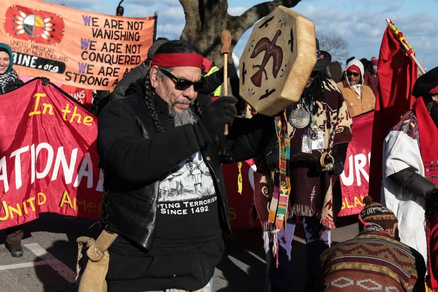 Since 1970, the United American Indians of New England (UAINE) have organized the National Day of Mourning on Cole’s Hill in Plymouth each Thanksgiving Day, directly contesting the mythology unfolding a few streets away in commemorative events. The observance originated when Wampanoag activist Wamsutta (Frank B.) James was invited to speak at a state banquet marking the 350th anniversary of the Mayflower’s arrival, only to have his prepared remarks deemed too critical and suppressed. Rather than deliver a sanitized speech, James and fellow organizers gathered outside to denounce genocide, treaty-breaking, and ongoing racism, inaugurating an annual counter-ceremony.