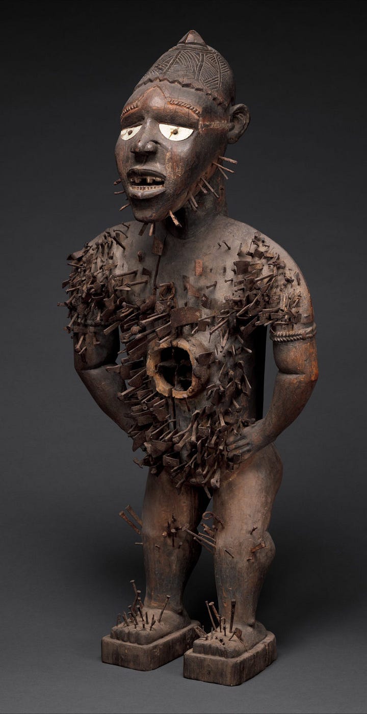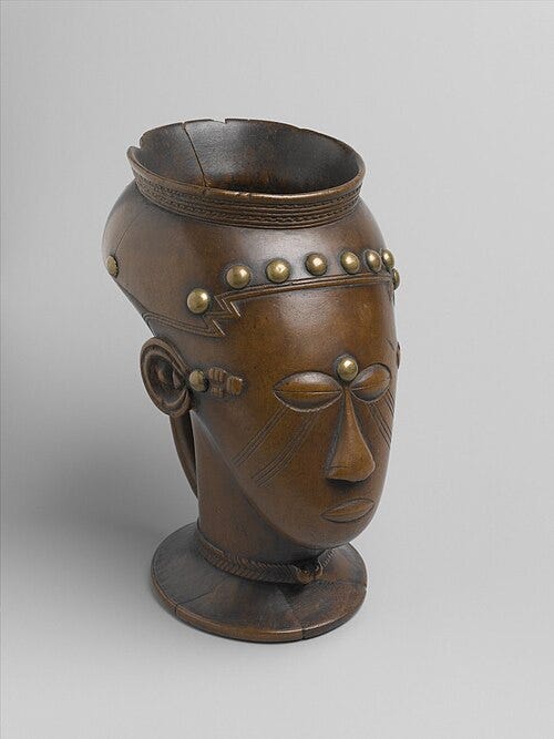 Looking at Central Africa, the Kongo and Kuba kingdoms had rich art traditions too, but with different emphases. The Kongo crafted power figures (nkisi) with nails and did wood carving, and the Kuba made elaborately patterned wooden cups, textiles, and royal portraits in wood. They didn’t have large bronze industries like Benin (copper alloy casting was less central, though there were some brass castings in lower Congo). Instead, they used copper in nearly pure form as currency tokens or ceremonial pieces. If we compare the symbolism; Benin’s leopard vs. Kuba’s crocodile or turtle (as kingly symbols in Kuba royal drum stools), each culture picked local fauna to represent kings.