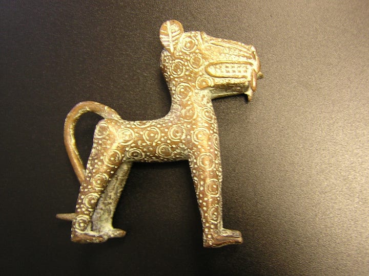 Benin sculptors also crafted full-length figures, both free-standing and in relief. Examples include royal figures such as the “Mounted ruler” or equestrian Oba, statues depicting a king on horseback, attended by followers. Because horses were rare and prestigious in the rainforest environment of Benin, equestrian images signified military prowess and leadership. In these sculptures the Oba often appears larger than his horse, again reflecting hierarchical proportions and the idea that the king is metaphorically “bigger” than ordinary reality. Other sculptures represent palace chiefs, warriors, and even Europeans. The Benin brass casters did not shy away from portraying foreign figures: a notable example is a 16th-century Portuguese soldier sculpture, showing a musket-bearing European mercenary in astonishing detail, down to his armor, weapons, and even the styling of his facial hair. Such pieces likely celebrated the alliance and trade between Benin and Europe; they may also have had an almost talismanic role, symbolizing the Oba’s ability to command support from powerful outsiders. Animals were another frequent subject. Leopards, emblems of royal power, were cast in life-size as intimidating statues or depicted in smaller ornaments. The leopard’s ferocity and dominance in the forest made it an apt symbol for the oba (who was often called the “Leopard of the House”). Likewise, animals associated with the gods or with royal metaphors appear, such as crocodiles and the mudfish (catfish). We find images of mudfish both in plaques and in the round. These eel-like fish, which can survive on land and deliver electric shocks, symbolized the Oba’s connection to the water god Olokun and his supernatural powers. The artisans of Benin demonstrated great creativity in incorporating these motifs into wearable art and courtly objects. For instance, intricately cast brass bells, bracelets, and pendants might feature interwoven crocodile heads or mudfish figures, simultaneously decorative and symbolic.