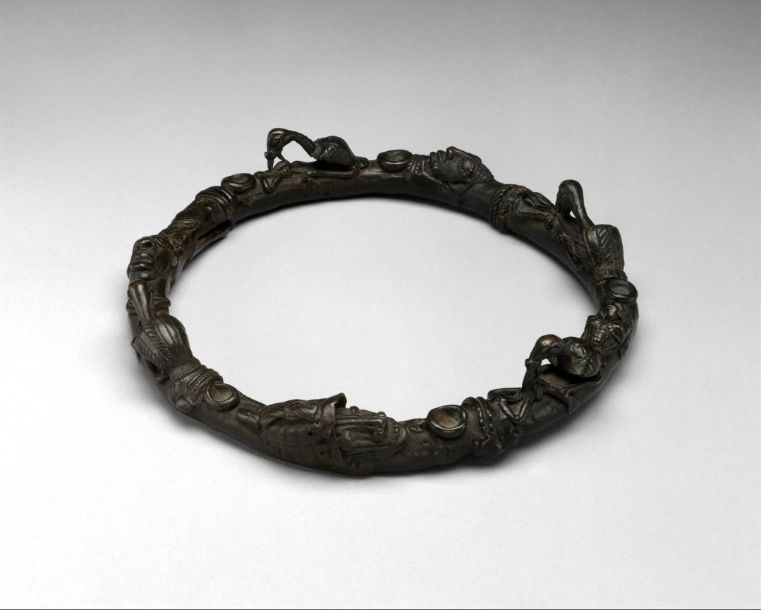One last noteworthy comparison is the Igbo Ukwu bronzes (9th century Nigeria). These are much older than Benin’s and were not royal art per se but appear to be from a shrine context. The Igbo Ukwu objects (intricate cast copper alloy vessels and ornaments) show an astonishing technical skill with filigree-like detail. They predate Benin by several centuries and prove that the knowledge of lost-wax casting was present in West Africa long before Benin’s heyday. In fact, some have wondered if there’s a lineage of technique from Igbo Ukwu to Benin (likely not direct, given the gap in time and geography, but it indicates multiple inventions or transmissions of metallurgy). Igbo Ukwu art features abstract and natural forms (coiled snakes, spiders), and a unique aesthetics of micro-detail. Benin casting by contrast went for larger solid forms. Both are stunning, but Igbo Ukwu remains more mysterious due to lack of historical records. Benin art, with its human subjects and courtly use, is much more of a historical document.