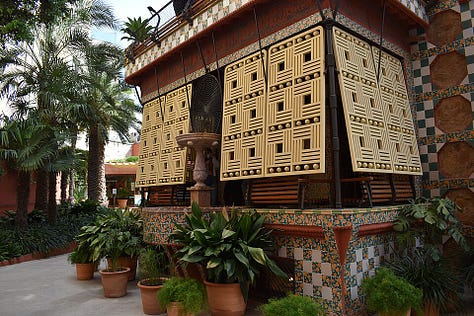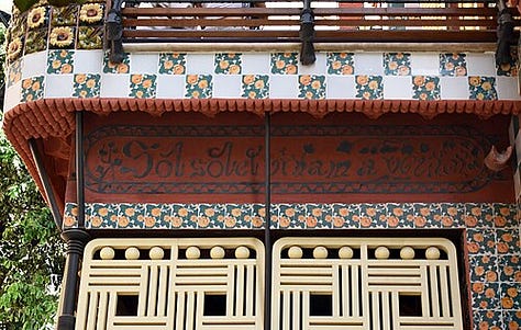 Moorish and Orientalist motifs dominate Casa Vicens, reflecting the nineteenth-century European fascination with exoticism as well as Gaudí’s own study of Islamic art and architecture. The façade is adorned with alternating bands of red brick and ceramic tiles, many featuring vivid floral patterns. This polychromy and geometric articulation evoke the decorative traditions of Andalusian and Mudéjar architecture, particularly the Alhambra in Granada, which Gaudí admired for its integration of surface ornament and structural harmony.