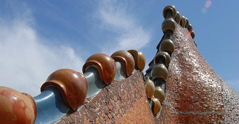 Gaudí applied similar principles in his secular projects. At Casa Batlló, the façade itself takes on sculptural qualities. Balconies resemble skeletal jaws or masks, while the undulating roof recalls the scaled back of a dragon. Here, architecture becomes allegory, the building’s surface narrating the legend of Saint George and the dragon. The integration of mosaic, ironwork, and organic sculptural form produces a façade that is both decorative and symbolic, inviting viewers to read the building as a mythological text.